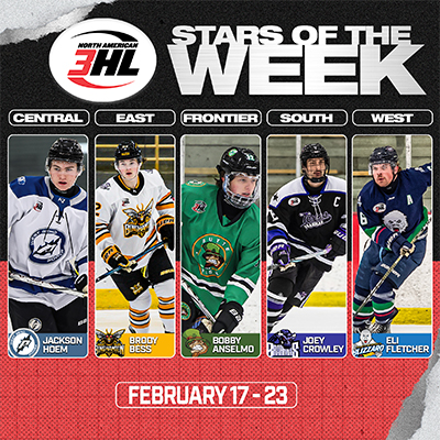 The North American 3 Hockey League (NA3HL) is pleased to announce the Divisional Stars of the Week for the week ending in February 23rd. The Divisional Stars of the Week is an award given each week of the regular season to the top performing players in each of the five divisions of the NA3HL as nominated by their head coaches.