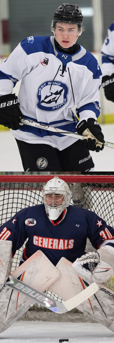 Jackson Hoem (top) scored the game tying and game winning goals for West Bend. Jascha Grossenbacher was perfect in the afternoon with 37 saves on 37 shots.