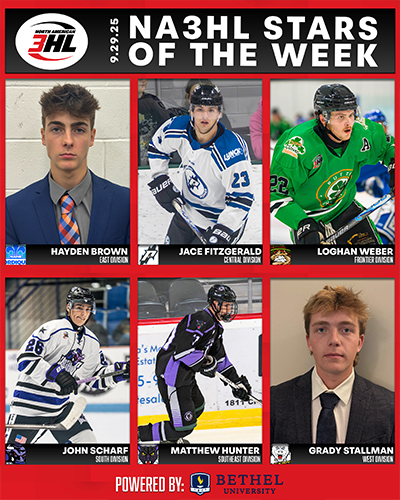The North American 3 Hockey League (NA3HL) is pleased to announce the Divisional Stars of the Week for the week ending September 28, sponsored by Bethel University. This weekly award recognizes the top-performing players from each of the league’s six divisions, as nominated by their head coaches, for their outstanding contributions on the ice.