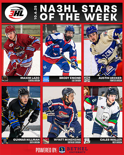 The North American 3 Hockey League (NA3HL) is pleased to announce the Divisional Stars of the Week for the week ending October 5, sponsored by Bethel University. This weekly award recognizes the top-performing players from each of the league’s six divisions, as nominated by their head coaches, for their outstanding contributions on the ice.