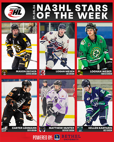 The North American 3 Hockey League (NA3HL) is pleased to announce the Divisional Stars of the Week for the week ending January 4th, sponsored by Bethel University. This weekly award recognizes the top-performing players from each of the league’s six divisions, as nominated by their head coaches, for their outstanding contributions on the ice.