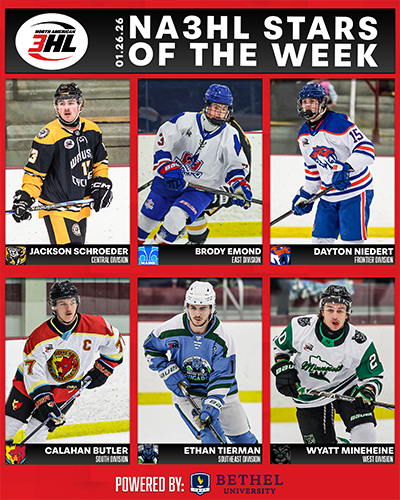 The North American 3 Hockey League (NA3HL) is pleased to announce the Divisional Stars of the Week for the week ending January 25th, sponsored by Bethel University. This weekly award recognizes the top-performing players from each of the league’s six divisions, as nominated by their head coaches, for their outstanding contributions on the ice.